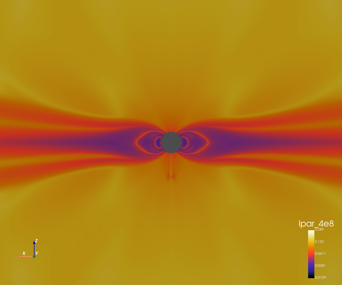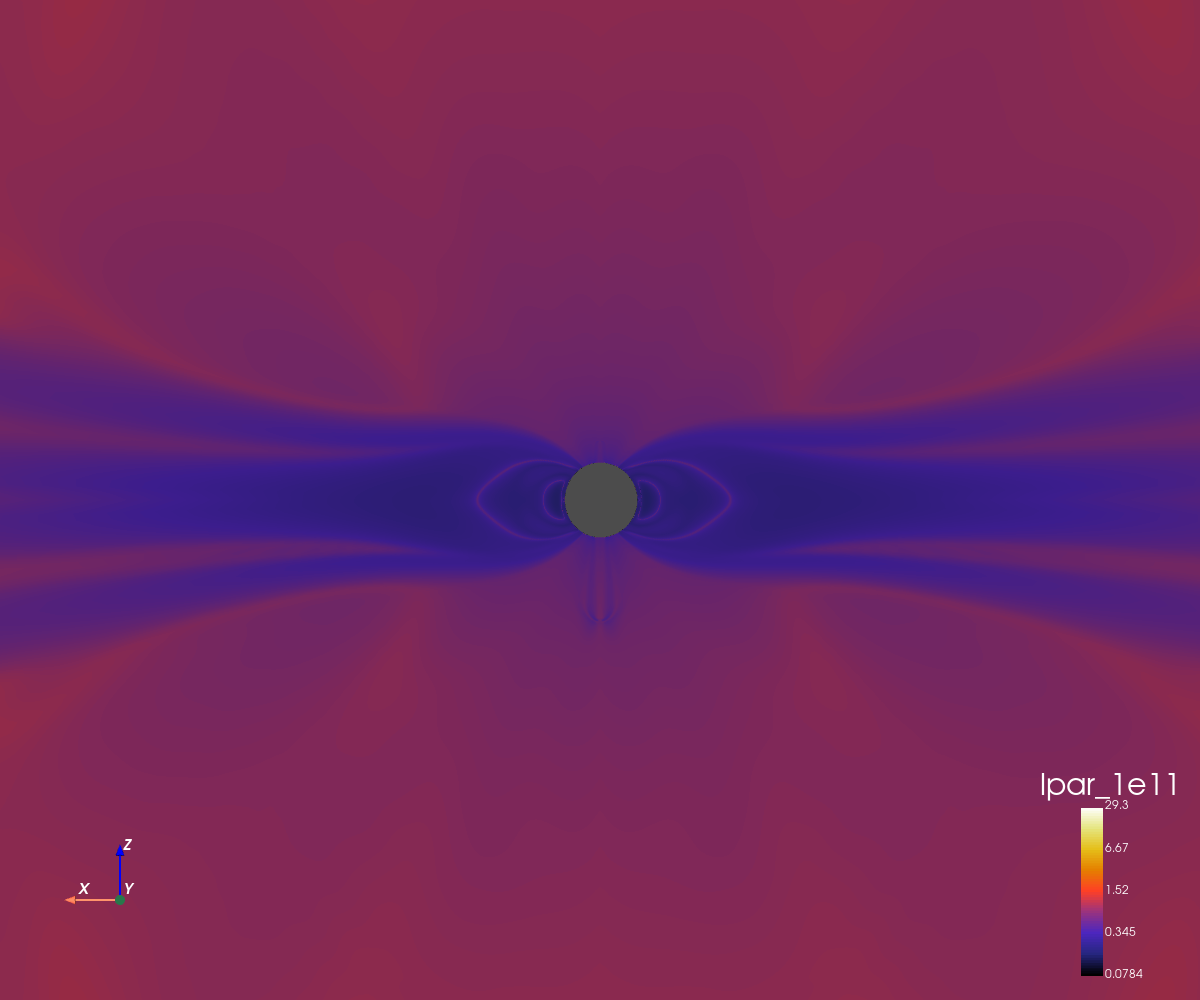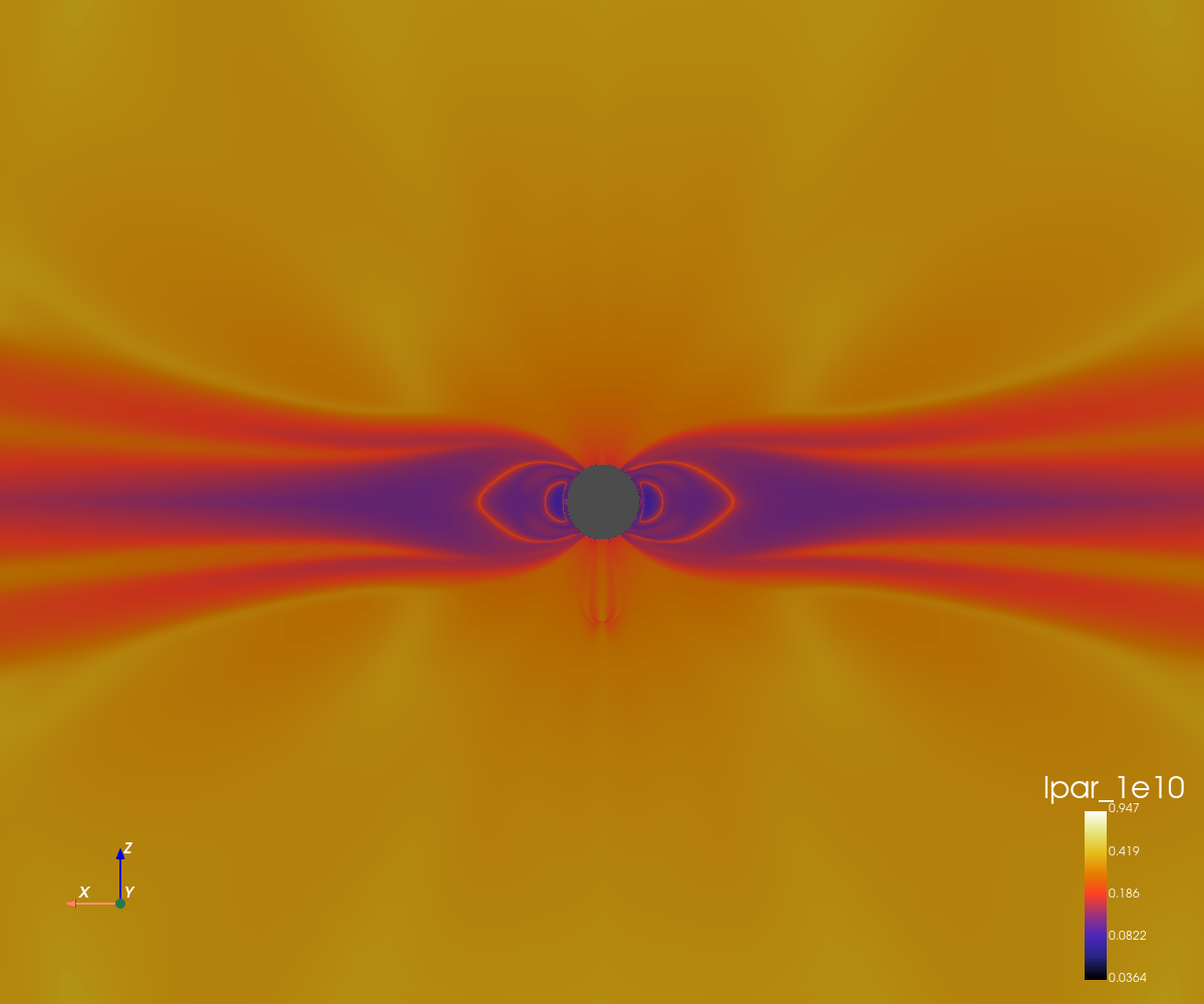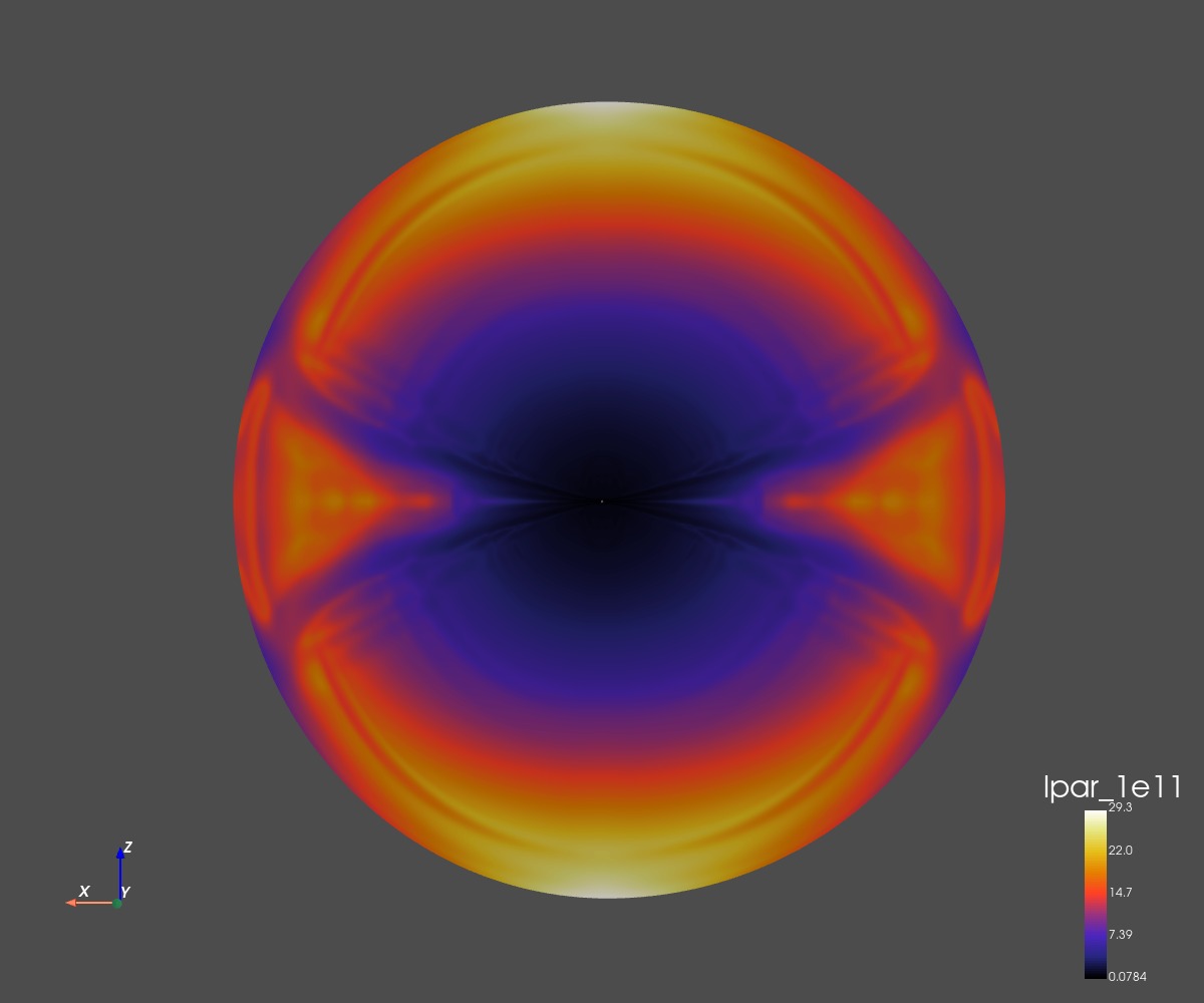 This simulation corresponds to a dipolar configuration with a high magnetic amplitude (5 Gauss at the poles).