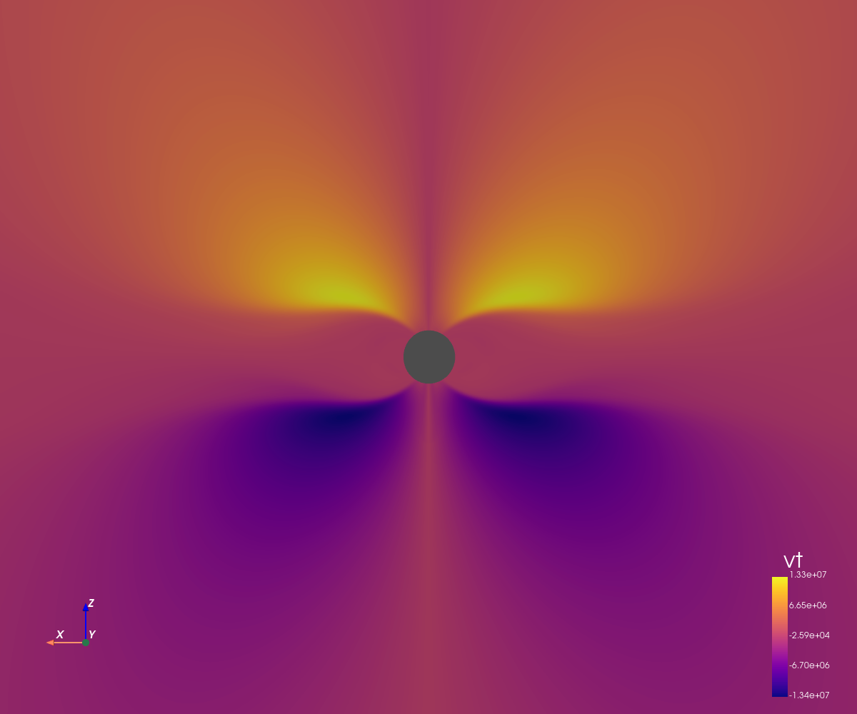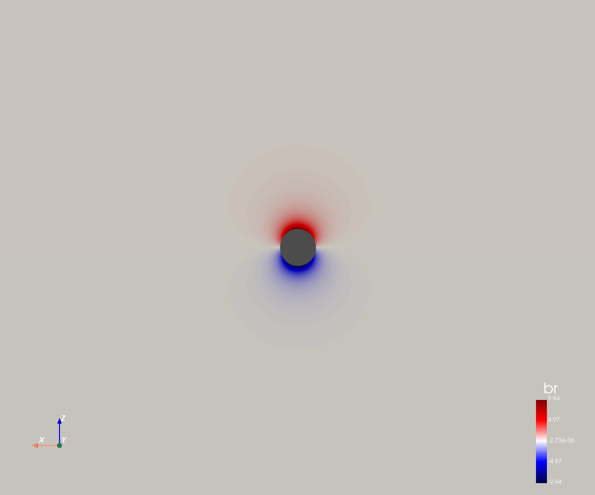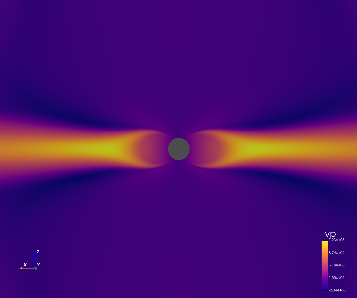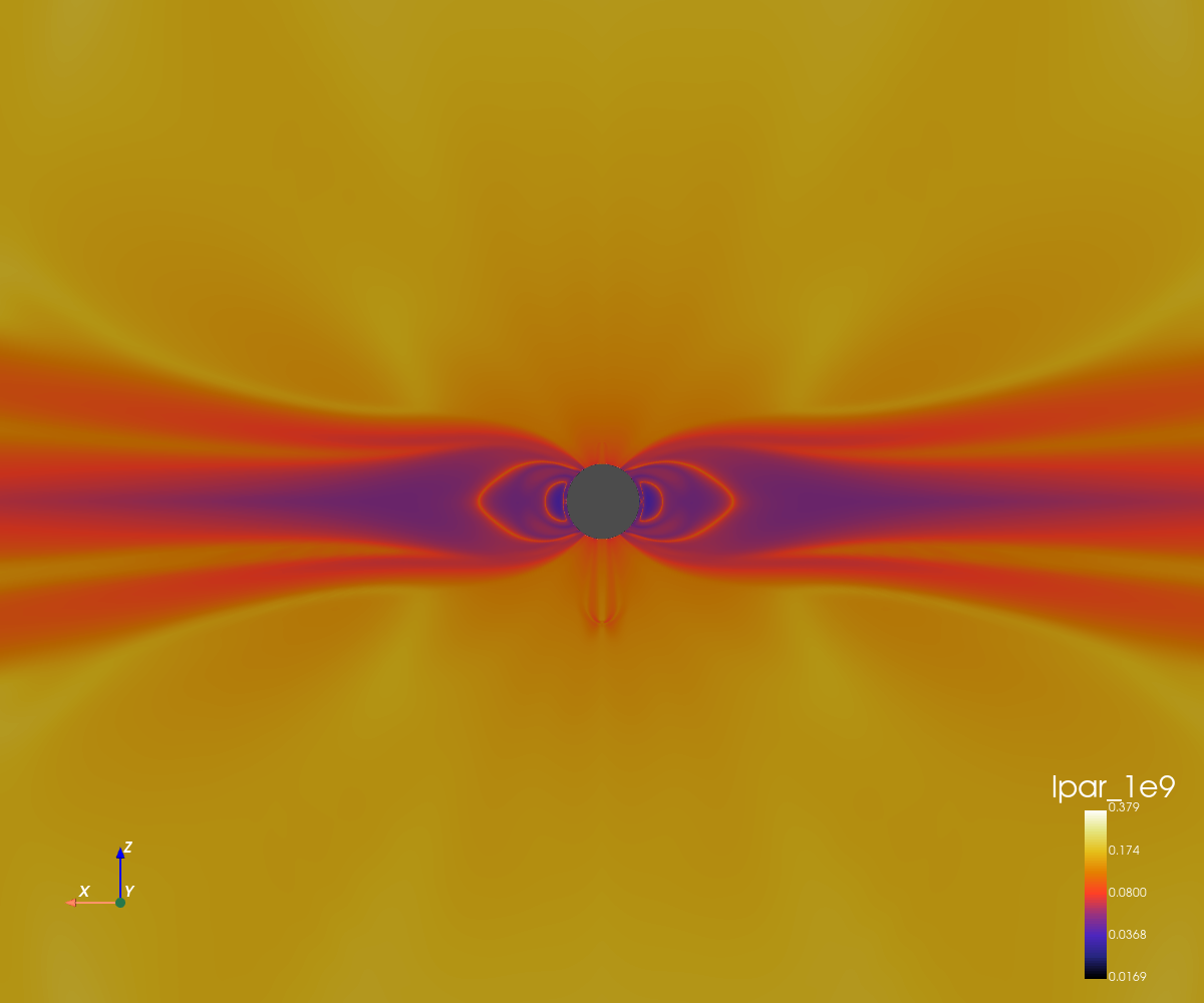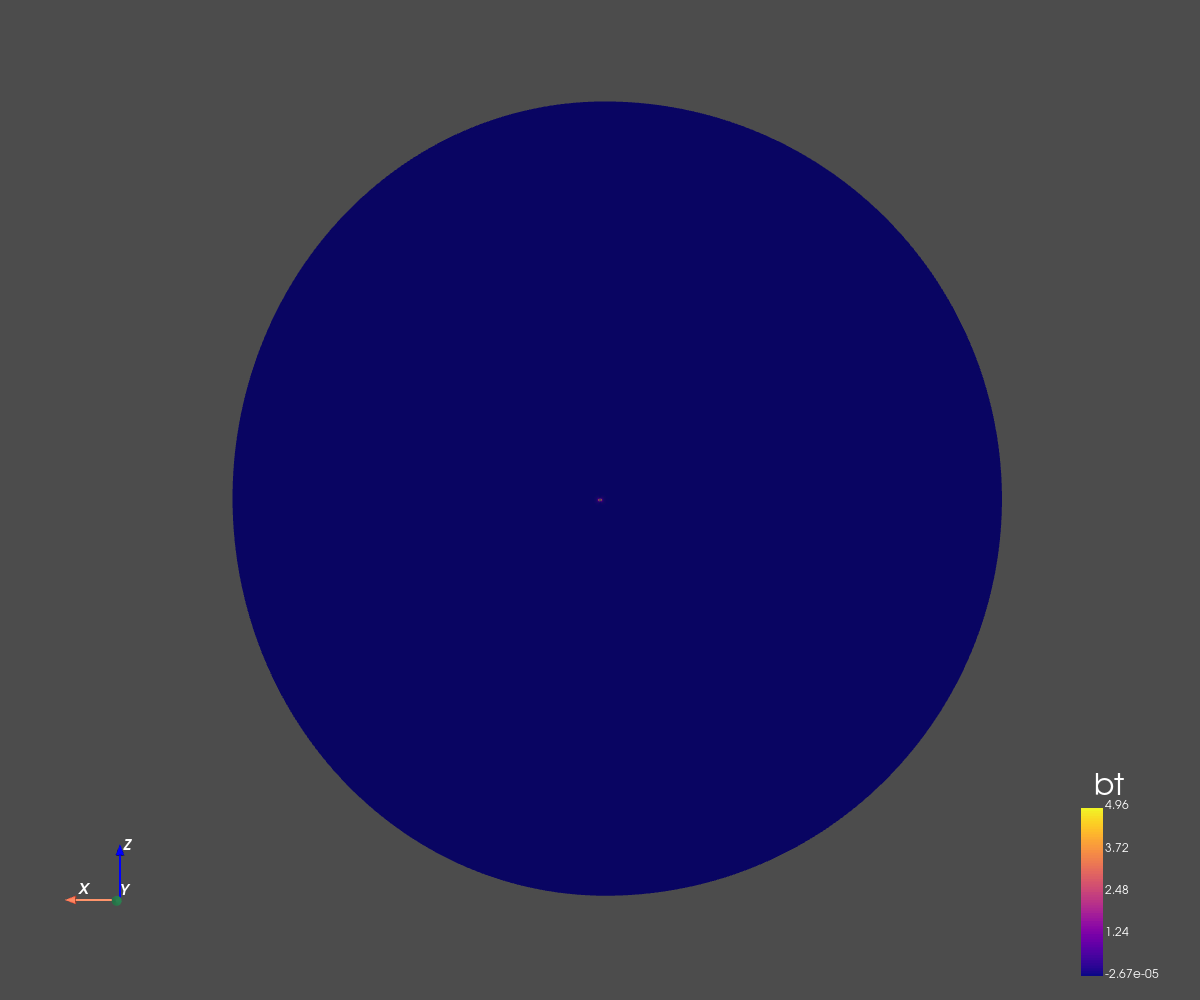 This simulation corresponds to a dipolar configuration with a high magnetic amplitude (5 Gauss at the poles).