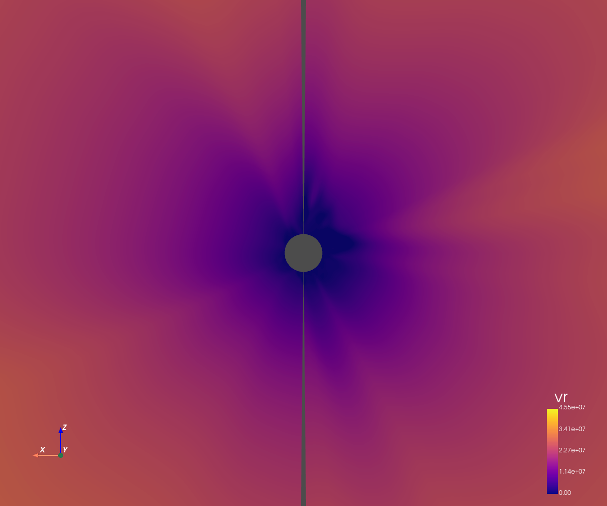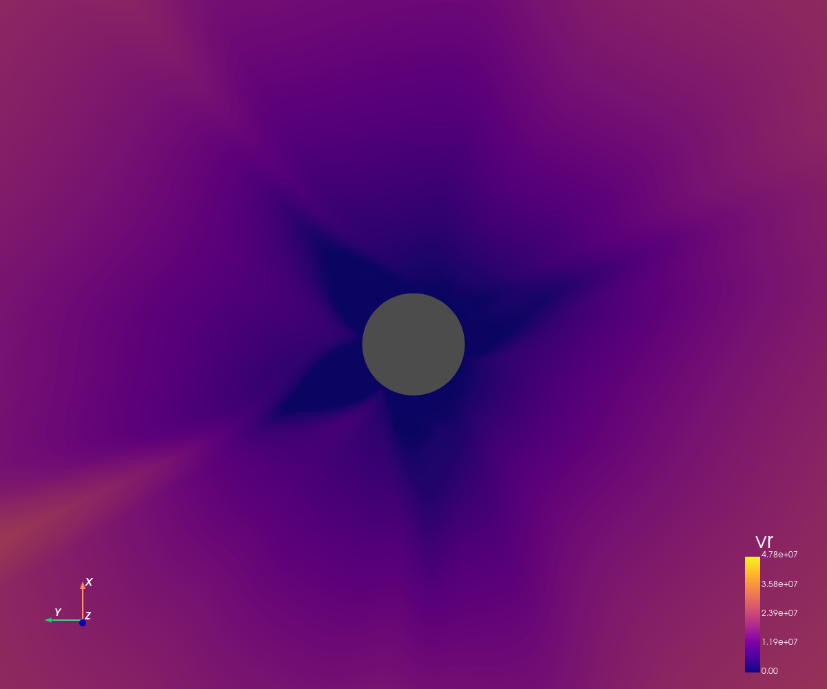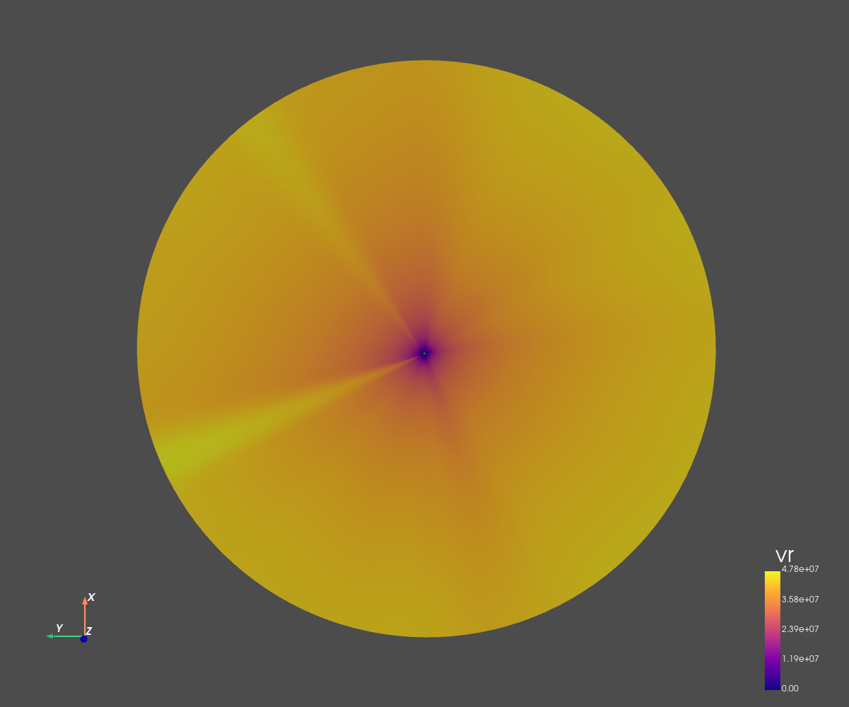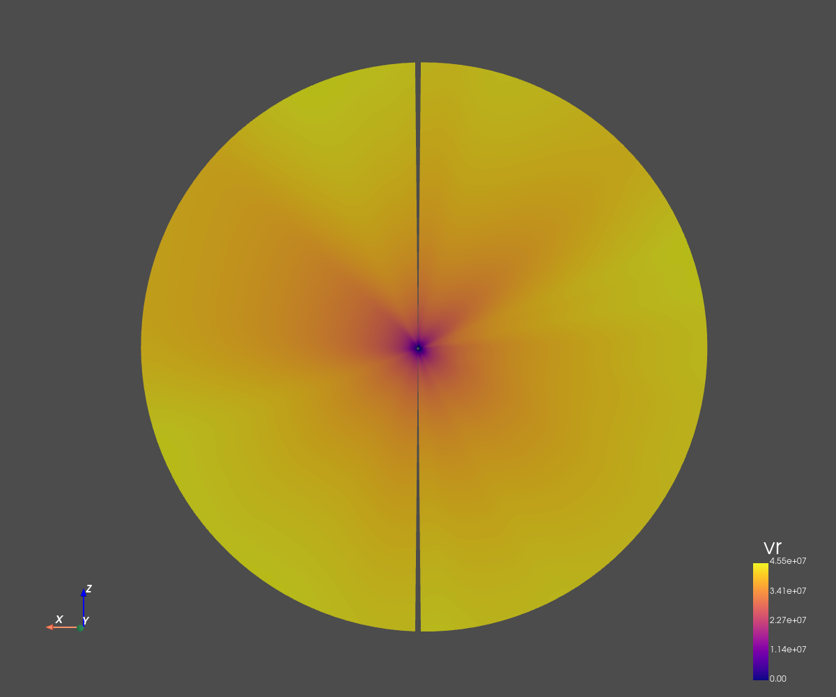 Radial velocity of the solar wind (equatorial view, which means in the XY plane) (cm/s)