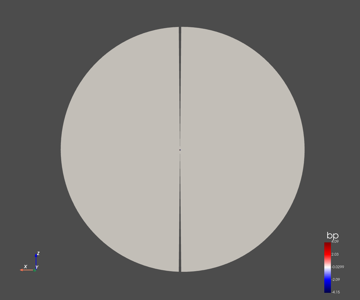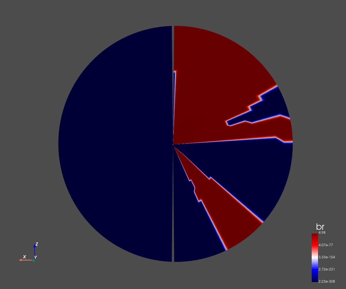 Zoomed longitudinal magnetic field of the star (meridional view, which means in the XZ plane) (G)