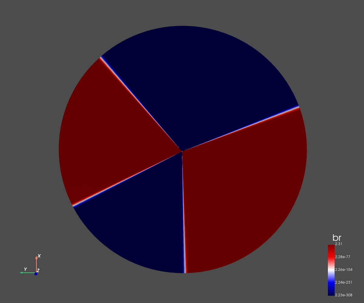 It has been initialized using data from the Mount Wilcox Observatory (map Br_wilcox1999.70||15.c). The radial magnetic field is then filtered using spherical harmonics decomposition (here up to lmax=15).