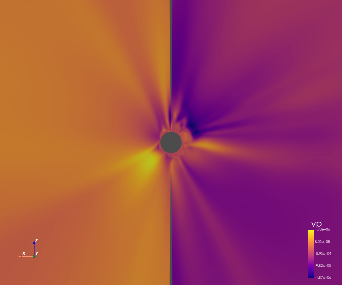 Zoomed longitudinal velocity of the solar wind (equatorial view, which means in the XY plane) (cm/s)
