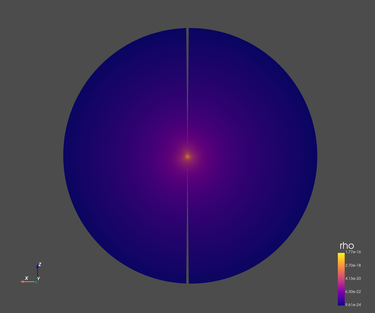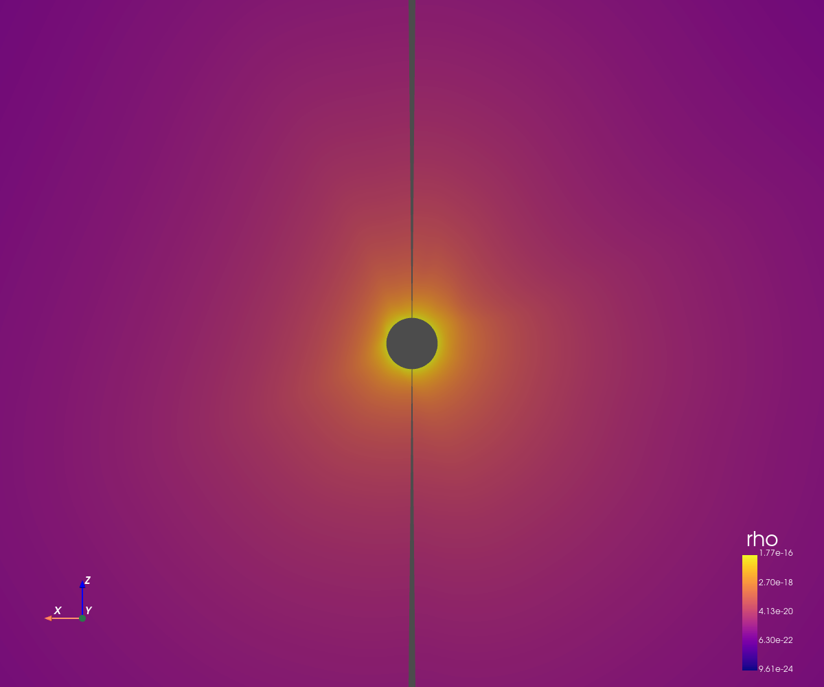 Zoomed density of the solar wind (meridional view, which means in the XZ plane) (g/cm^3)