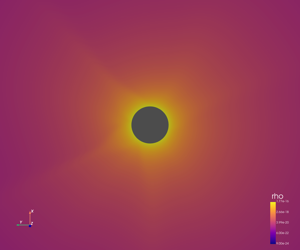 Density of the solar wind (equatorial view, which means in the XY plane) (g/cm^3)