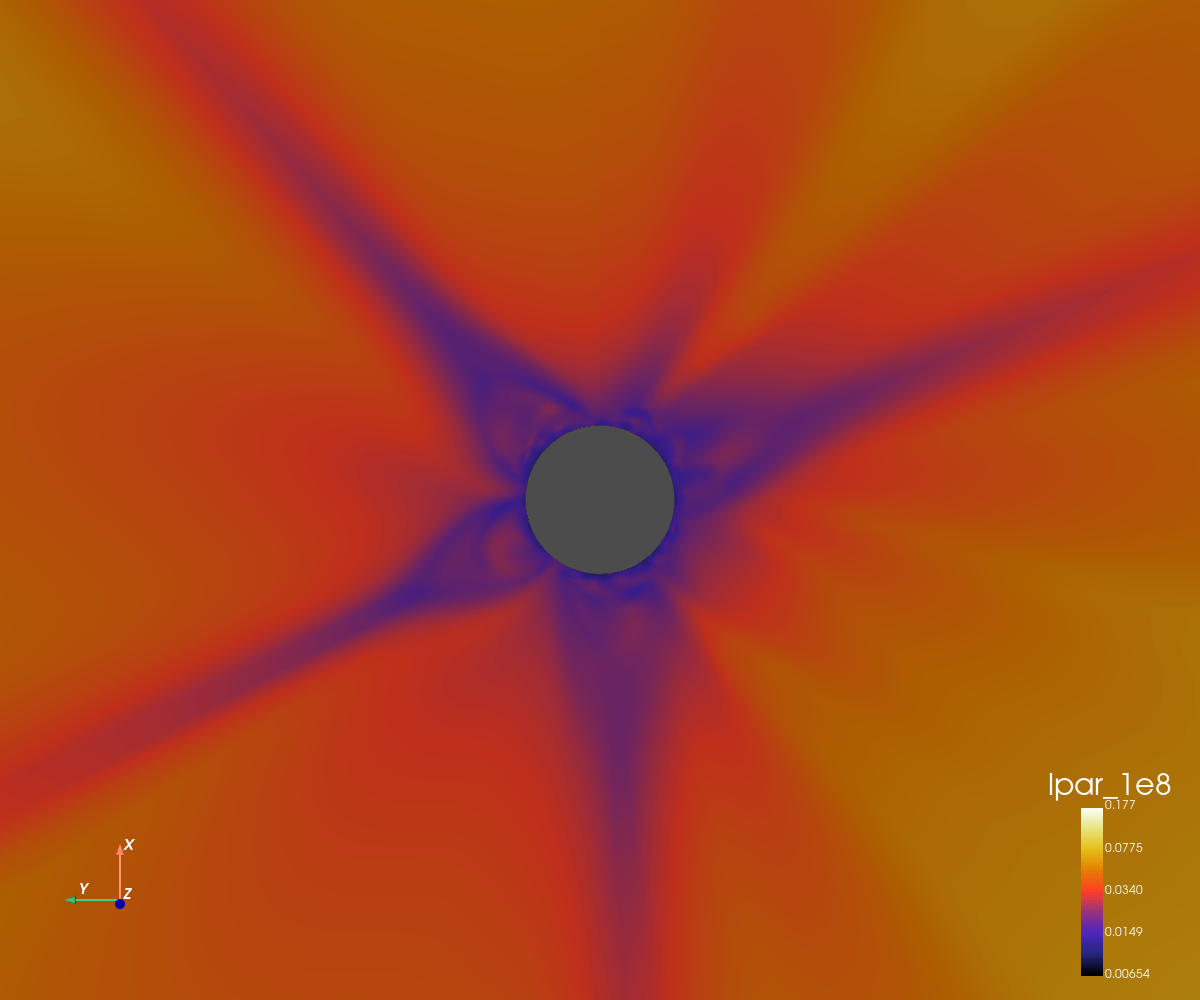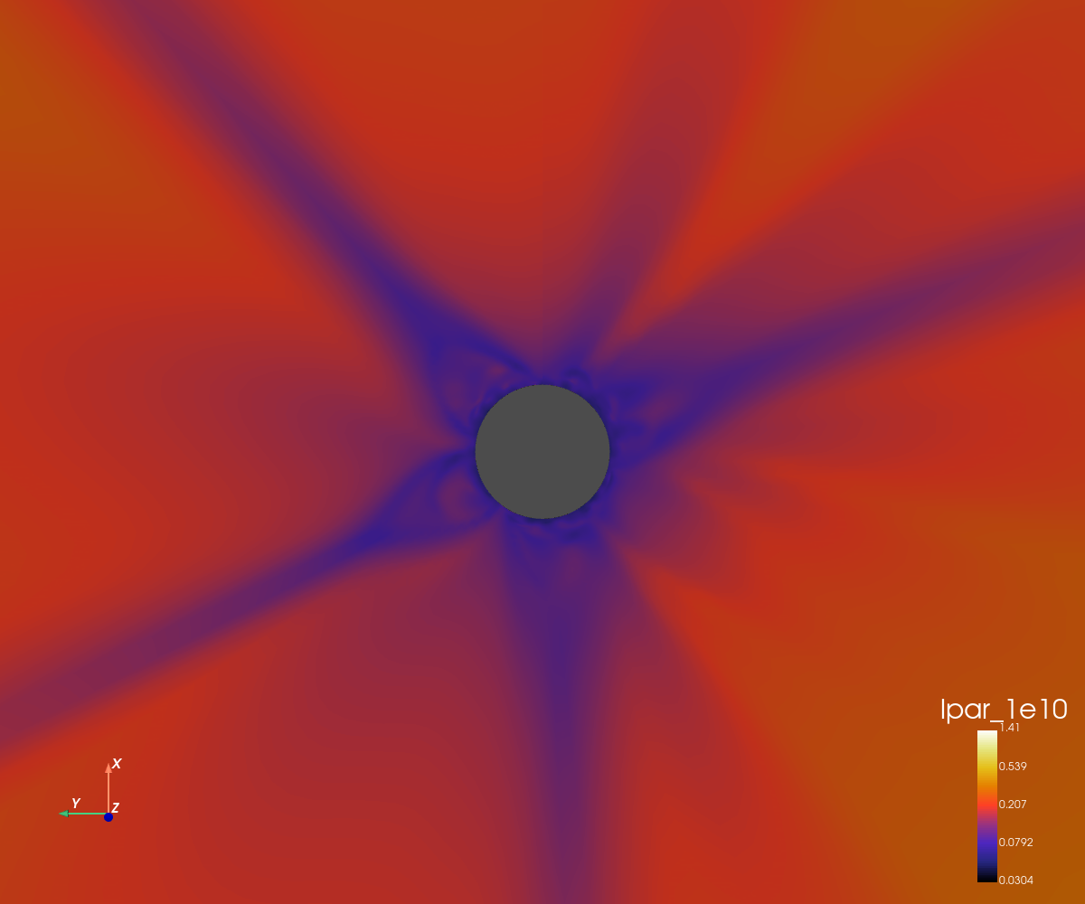Zoom on parallel mfp for a particle with rigidity of 1e5 MV (AU) (equatorial view, which means in the XY plane)
