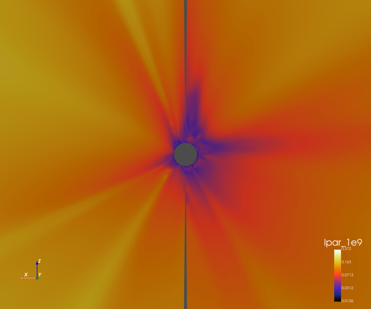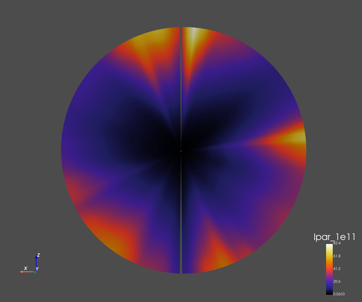 Zoom on parallel mfp for a particle with rigidity of 1e3 MV (AU) (meridional view, which means in the XZ plane)