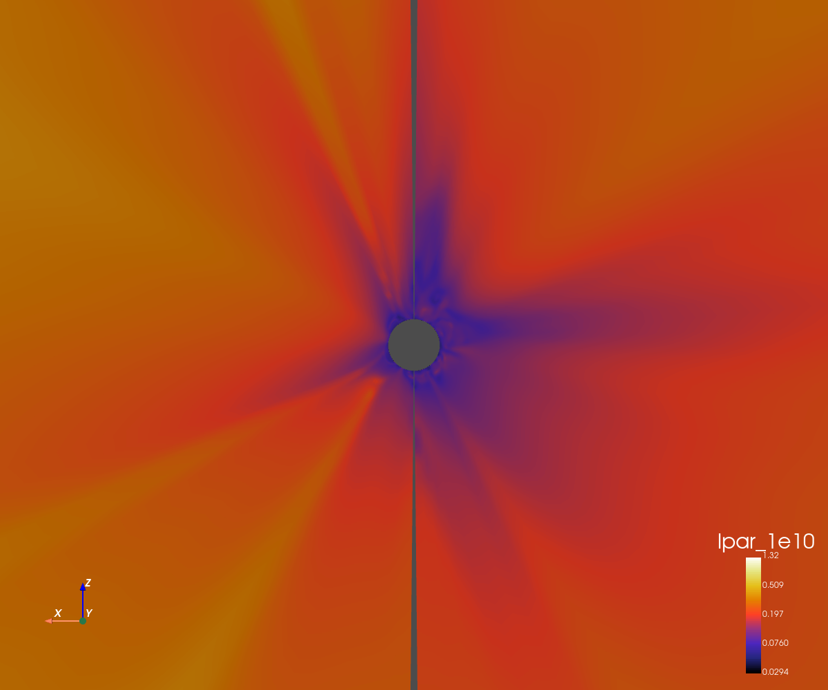Zoom on parallel mfp for a particle with rigidity of 1e4 MV (AU) (meridional view, which means in the XZ plane)