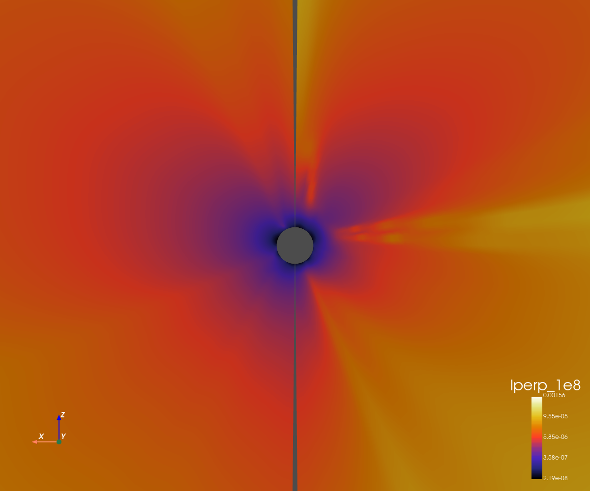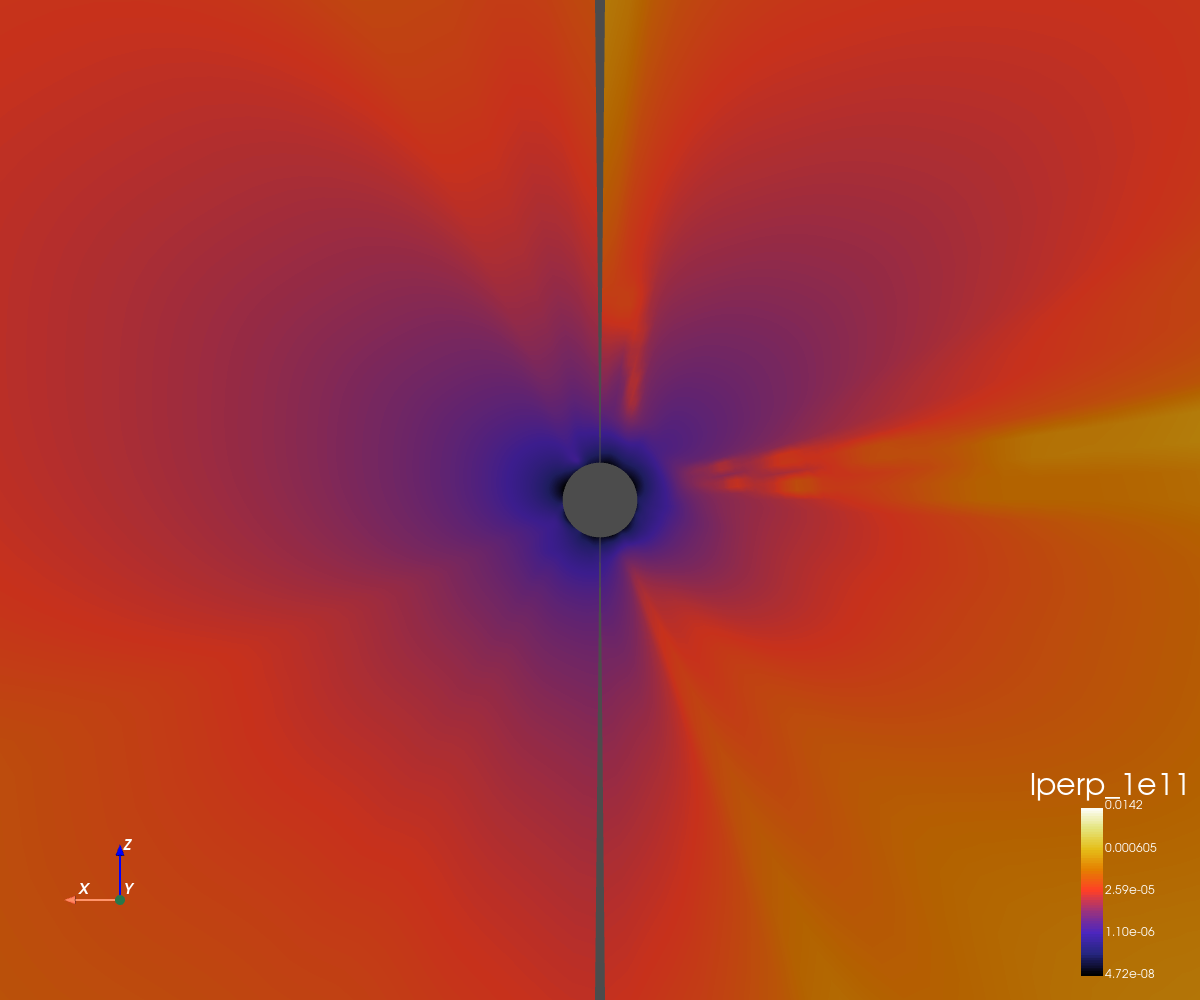 Perpendicular mfp for a particule with rigidity of 1e5 MV (AU) (meridional view, which means in the XZ plane)
