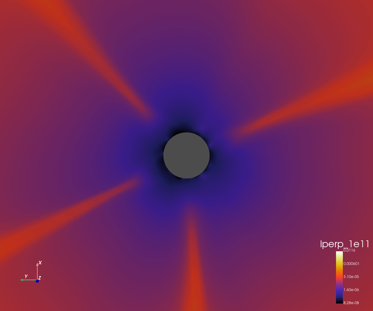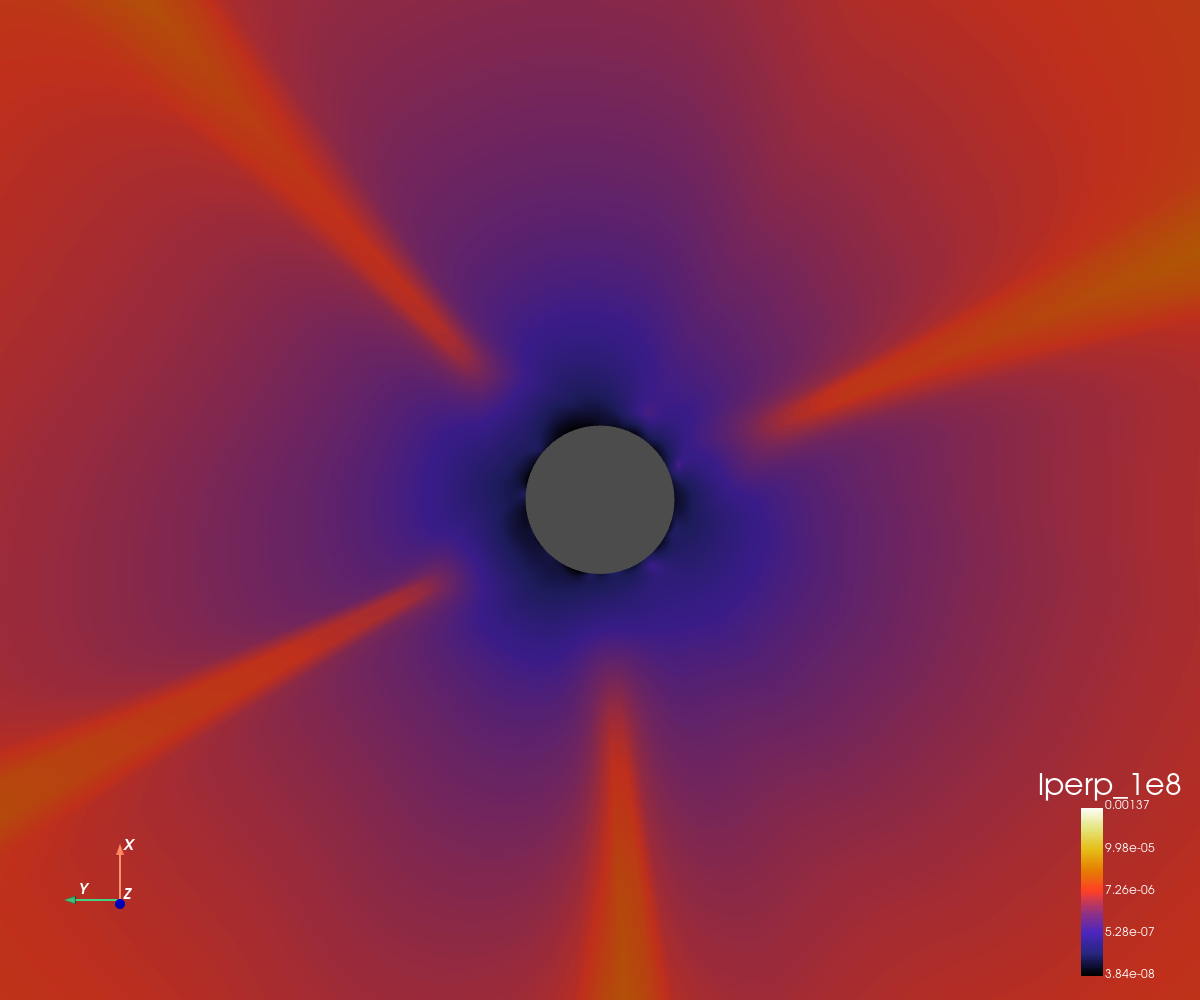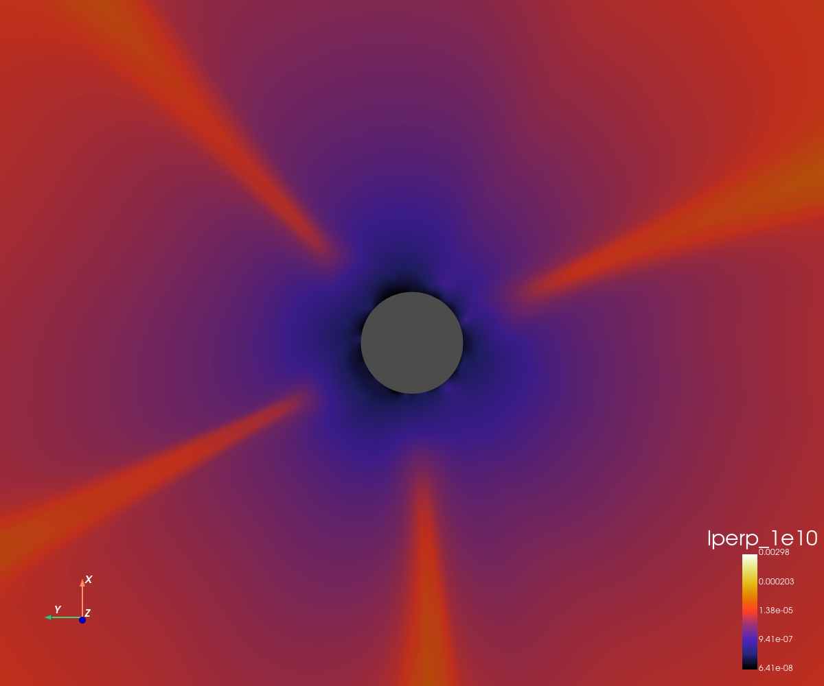 Perpendicular mfp for a particule with rigidity of 100 MV (AU) (equatorial view, which means in the XY plane)