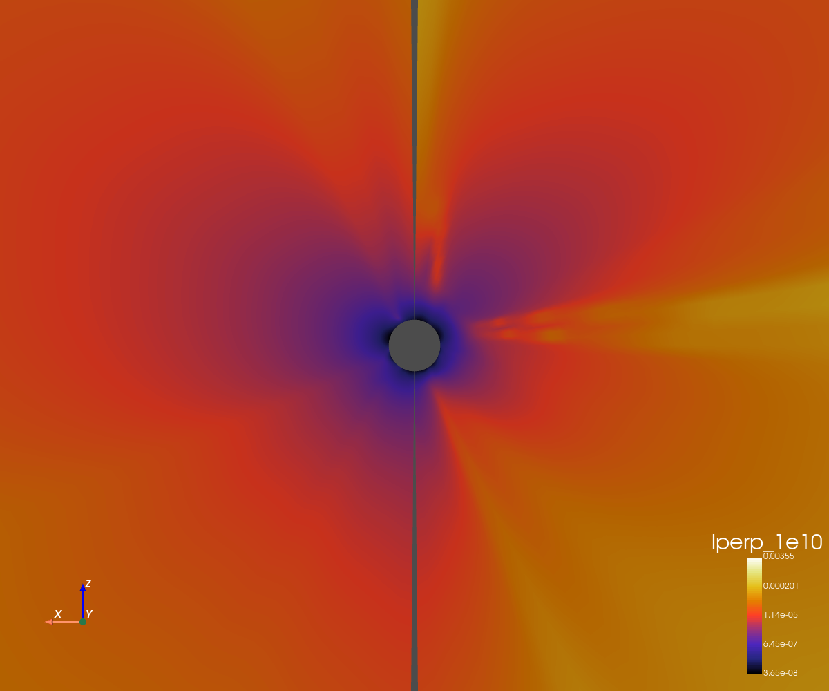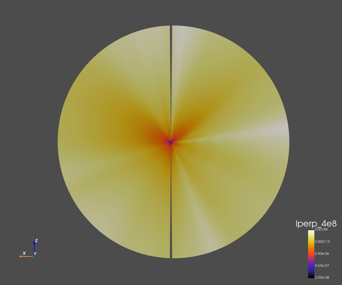 Perpendicular mfp for a particule with rigidity of 1e4 MV (AU) (meridional view, which means in the XZ plane)