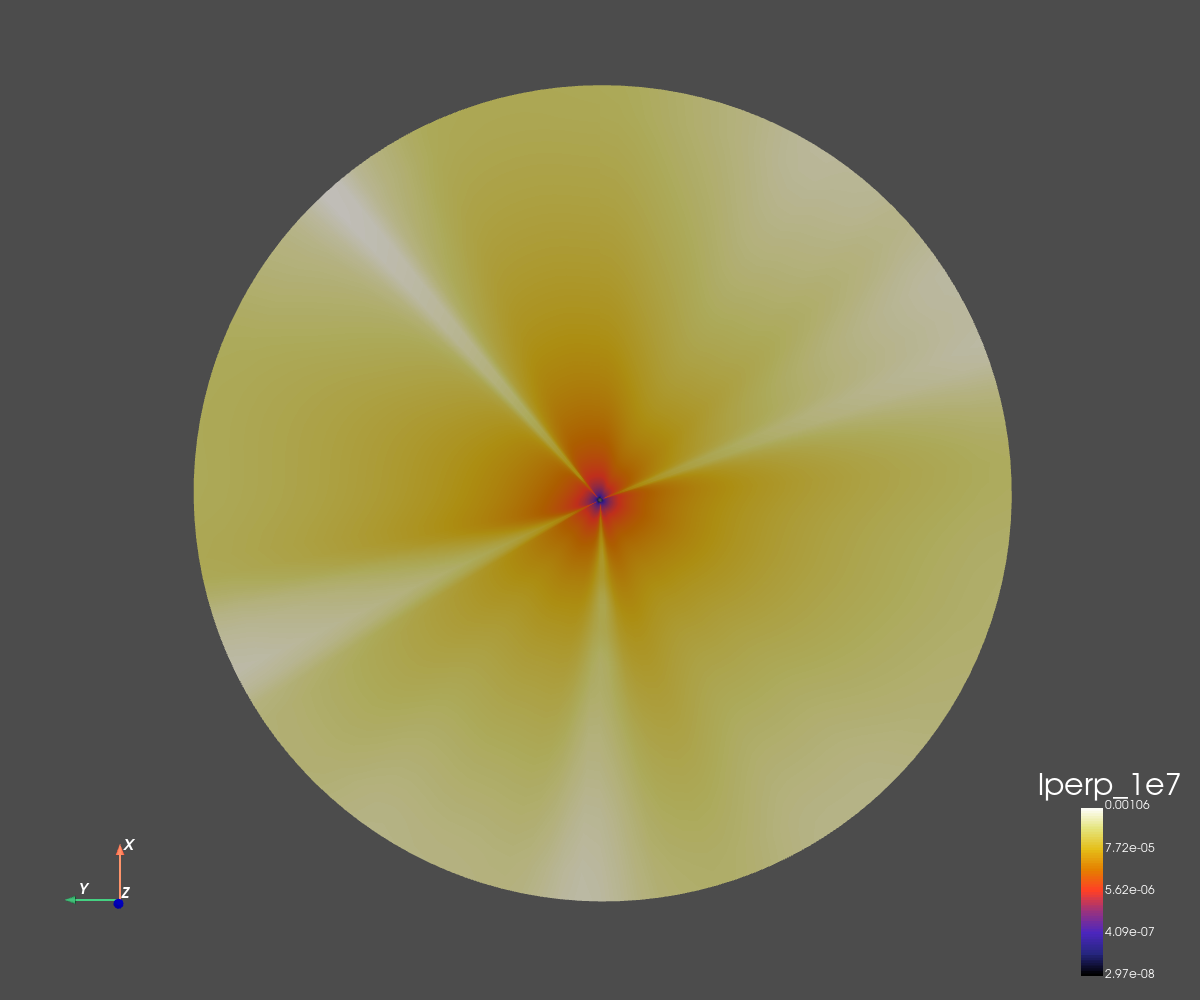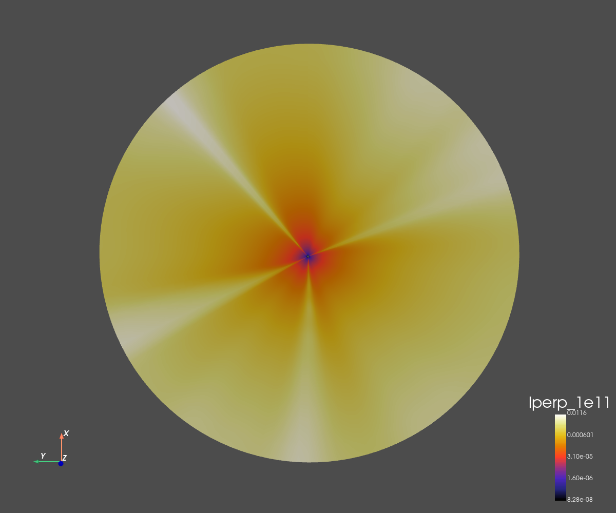 Perpendicular mfp for a particule with rigidity of 1e5 MV (AU) (equatorial view, which means in the XY plane)