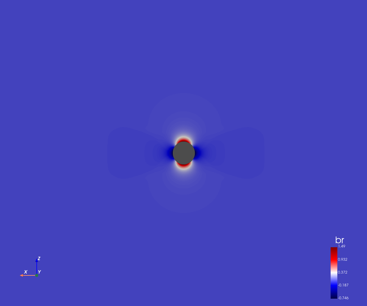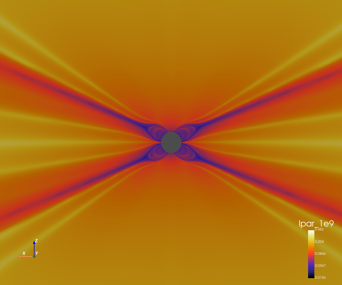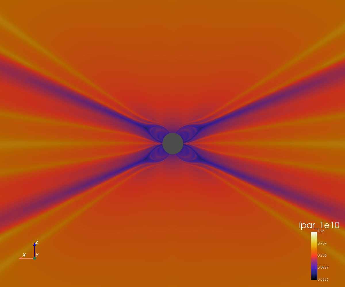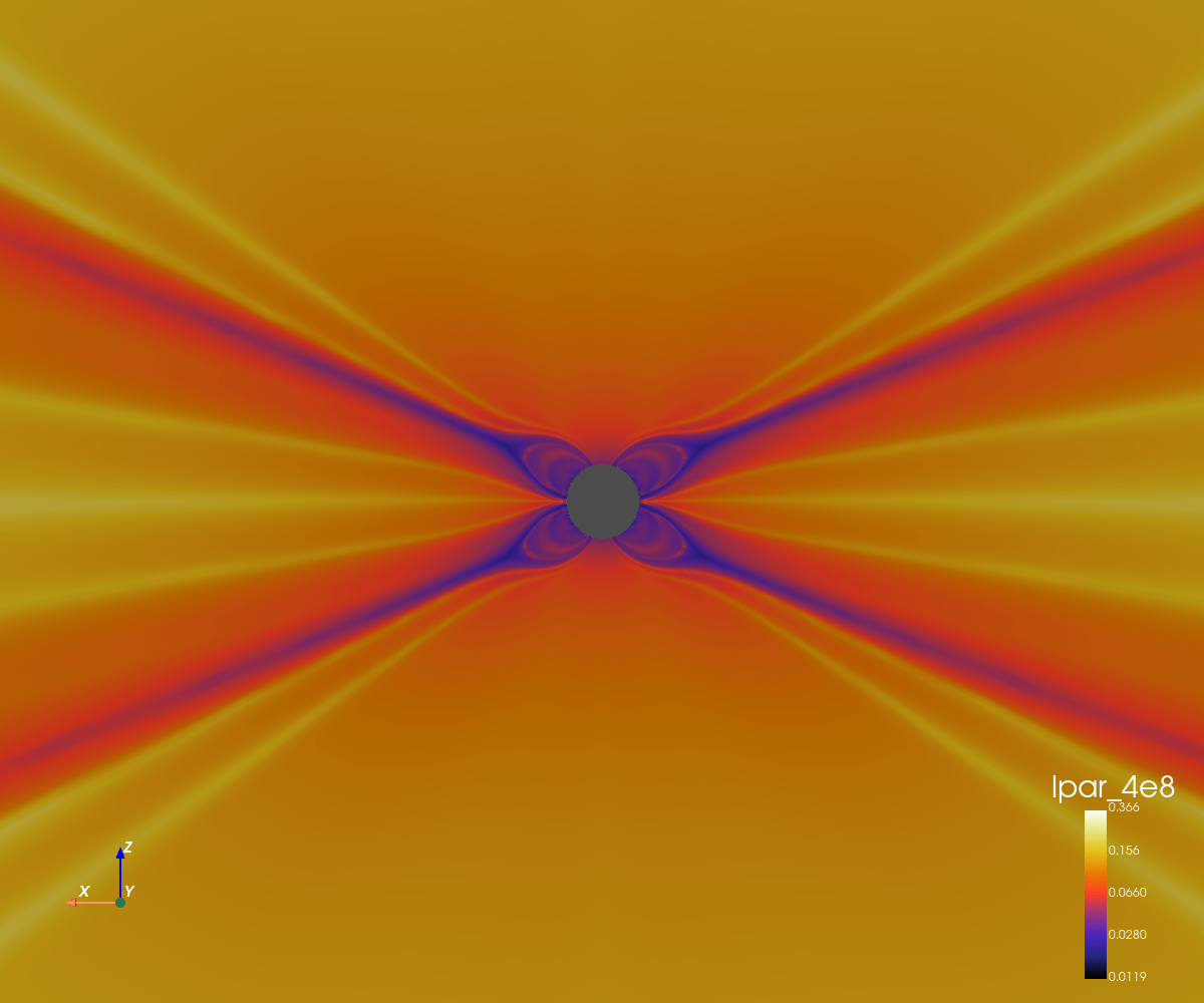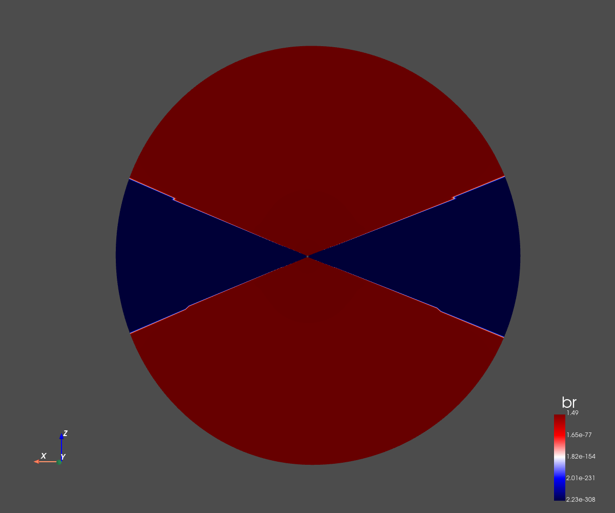 This simulation corresponds to a quadripolar configuration with a low magnetic amplitude (0.5 Gauss at the poles).