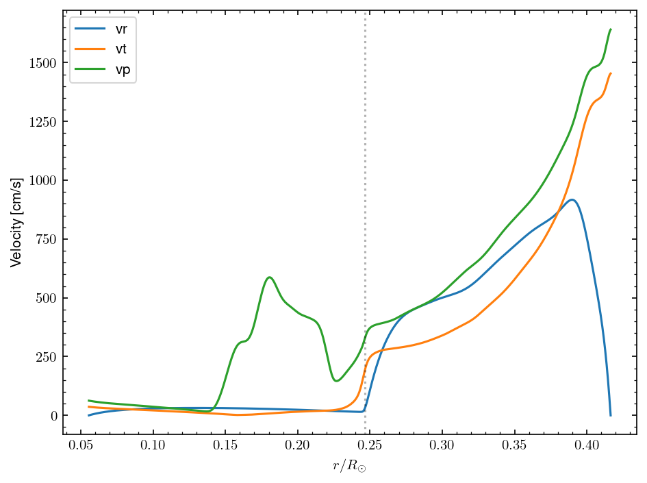 Root-mean square average on spheres of the spherical components of the velocity field [cm/s]